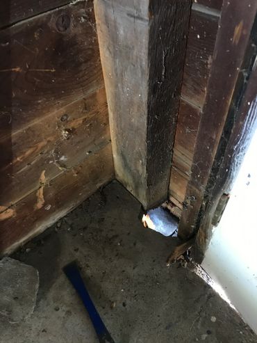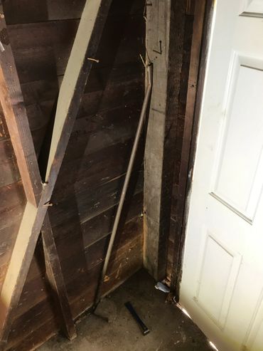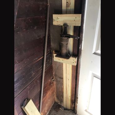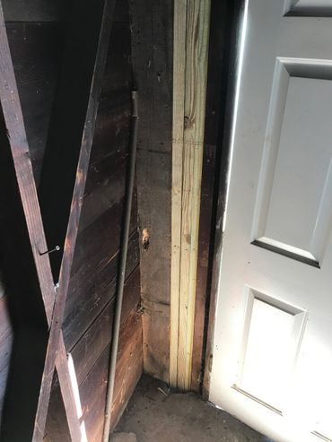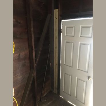 While replacing this garage door, it was obvious why the hinge side of the door had so much movement. Structural damage due to termites and contact with water over the years has eroded the bottom of the corner post. So, before replacing the door, the corner post of this two stale garage needed to be fixed for safety. As seen in the first photo, the corner support timber was eroded and floating off the ground about 8inches. To make a challange more involved, a repaired floating concrete garage floor did not allow the use a jack on the floor to transfer loads to the new support post. This alternate jacking method allowed the load to be added to the new support post as well as provide solid framing for the new door to be installed.