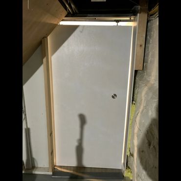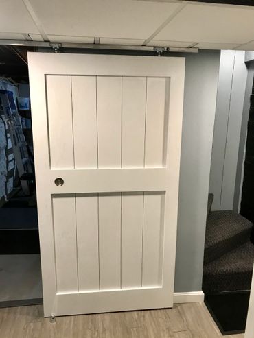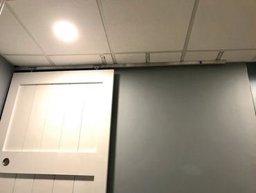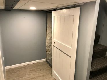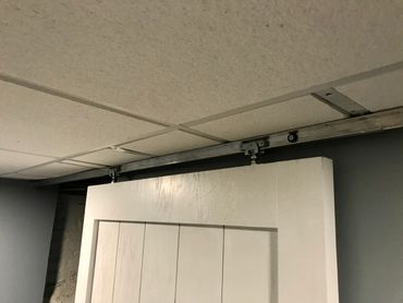 While there is nothing new about a barndoor, there is a rarity that comes with a barndoor in a basement with drop ceiling tiles. This was a fun challenge and turned out awesome. The client wanted to use the hallway for a desk, so a hinged door would not work. A standard barndoor with hardware above would not work because the ceiling clearance was much less then a standard door. The width was also wider then a standard “off the shelf” barndoor. Prism carved ahead by building and painting this sophisticated farmhouse style door. With the ultra low profile hardware, that still kept the essence of classic barndoor hardware, this fully functional door became a reality.
