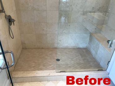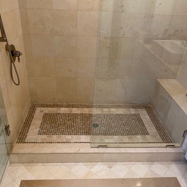 For posterity reason, Prism is respectful when it comes to avoiding a trip to the land fill. This shower floor was in great shape, other then some discoloration, the client also didn’t like the overall look and was not sure why. Prism agreed and was able to point out the reason. With the same color tile, floor to ceiling, the human eye does not feel grounded. The suggestion is to use a darker color on the floor which will give a sense of being grounded. It will also help the shower have a cohesive feel with the rest of the bathroom. Prism was also asked, if possible, to use the clients left over tiles from previous jobs to reduce costs. Choosing which tile would work and ensuring there was enough, while also adding a custom refined look of a design all had to be considered.